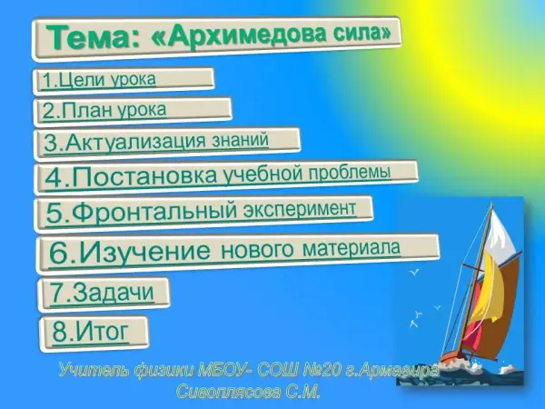 На уроке ученики обнаруживают наличие силы, выталкивающей тело из жидкости, устанавливают, от каких величин она зависит. Учащиеся развивают речь, умение самостоятельно строить гипотезы, делать выводы, формируют коммуникативные умения в парной, коллективной работе, а также разгадывают загадки, решают качественные задачи, находят соответствия между физическими величинами и единицами измерения, отвечают на вопросы, проводят фронтальный эксперимент.