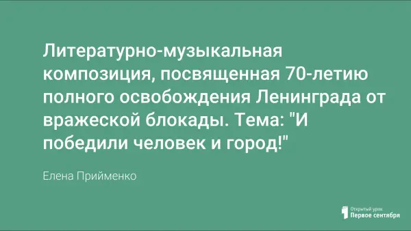 Литературно-музыкальная композиция разработана к 70-летию полного освобождения Ленинграда от вражеской блокады. Цель: формирование высоких морально-нравственных качеств личности, создание условий для дальнейшего развития подрастающего поколения. Материалы для мероприятия подобраны таким образом, чтобы заинтересовать учащихся историей Великой Отечественной войны, произведениями писателей и поэтов о том времени.