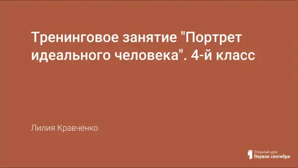 Треннинговое занятие проводится для осознания детьми образа идеального человека. На протяжении всей работы учащиеся знакомились и усваивали такие понятия, как "личность", "качества характера", "индивидуальность", "идеал", "эмоции", "чувства", "психологический образ". Цкль: применять полученные психологические знания в познании себя и других людей, обрести себя в творческом самовыражении.