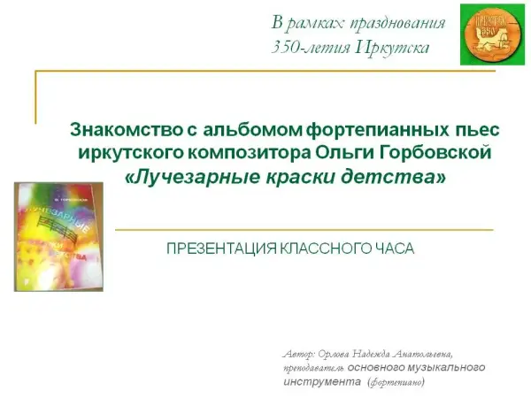 Классный час подготовлен для школьников к 350-летию г. Иркутска. Альбом фортепианных пьес иркутского композитора Ольги Олеговны Горбовской продолжает ряд сочинений для детей, написанных в разное время композиторами многих стран. Альбом издан небольшим тиражом, неизвестен широкой публике, может заинтересовать преподавателей музыкальных школ и учителей музыки в школе.