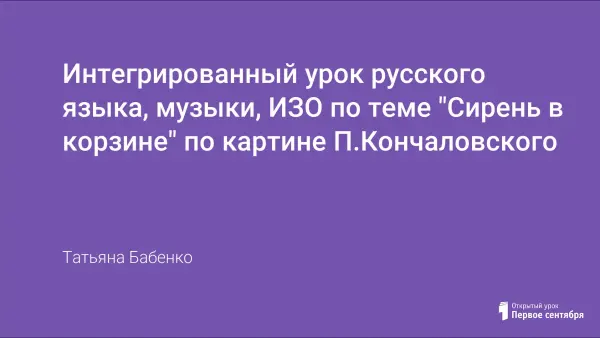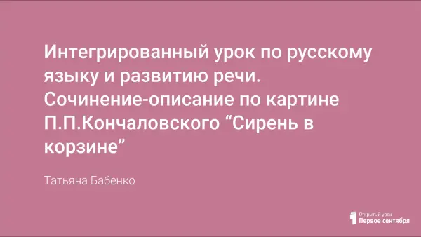 Интегрированный урок русского языка, музыки, ИЗО готовит к сочинению-описанию по картине П.Кончаловского «Сирень в корзине». Цель урока: помочь учащимся понять общее настроение картины, услышать звуки сиреневого сада; формировать умение анализировать картину как произведение искусства в единстве содержания и формы; научить отбирать материал, использовать его в творческой работе.