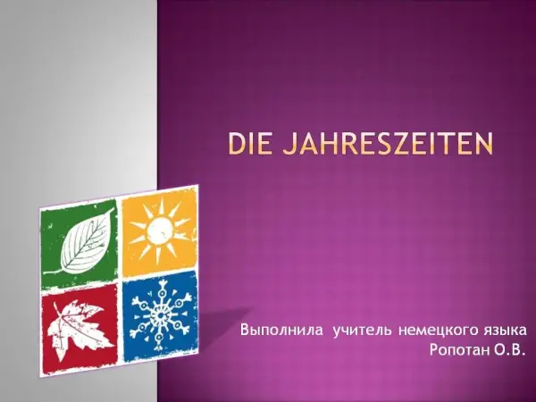 Цель урока: тренировать учащихся в употреблении знакомой лексики, учить использовать ее в речевых ситуациях; высказываться на заданную тему, использовать основные формы немецких глаголов прошедшего времени; формировать навыки употребления детьми лексики по теме. Прогнозируемый результат: учащиеся должны научиться составить связный рассказ по теме «Времена года».