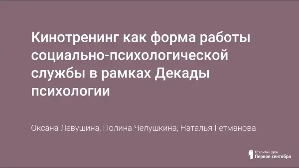 В статье рассказывается о групповой форме работы социально-психологической службы – кинотренинге, который способствует осмысленной коррекции собственных действий, изучению своего «Я» и ориентирует на понимание себя и других. Статья предназначена школьным психологам, педагогам, социальным педагогам.