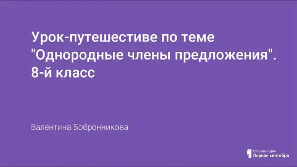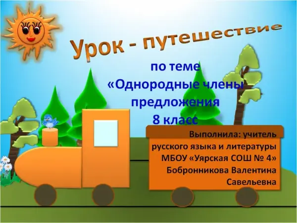 Обобщение и систематизация изученного материала проводится в форме урока-путешествия. Цель: отработать умения находить в текстах однородные члены предложения и определять их роль; различать предложения с однородными членами и сложные предложения; правильно использовать полученные теоретические знания в практических заданиях. Форма урока охватывает большой объем материала.