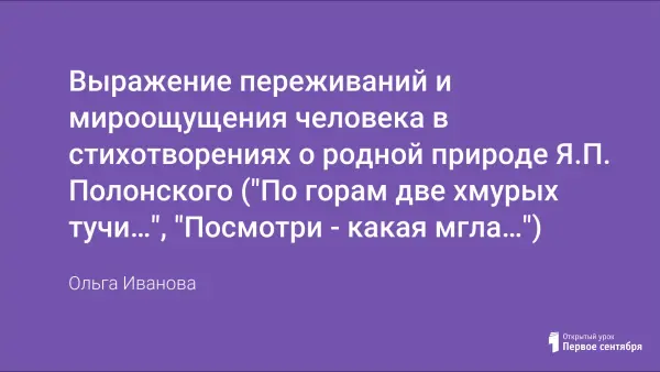 Лейтмотив урока – путешествие по картинной галерее, где предметом наблюдений становится русская природа. Преподаватель подробно анализирует словесные картины, созданные Яковом Петровичем Полонским. Учащиеся знакомятся с творчеством Я.П. Полонского и учатся воспринимать зрительные образы при чтении стихотворений.