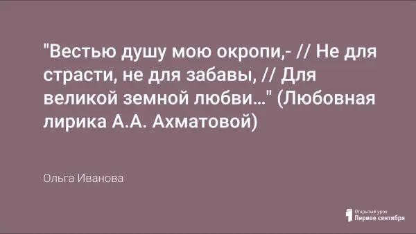 Урок проводится в форме литературной гостиной, где звучат воспоминания Ю.Анненкова из «Дневника моих встреч». На уроке школьники знакомятся с любовной лирикой А.А. Ахматовой; выявляют основные черты поэтики в анализе и интерпретации стихотворения «Сжала руки под темной вуалью…»
