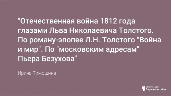 На уроке учащиеся анализируют, какой увидели Отечественную войну 1812 года любимые герои Л.Н. Толстого, один из которых Пьер Безухов: он стал участником Бородинского сражения, его глазами показана осажденная французами Москва. Цель урока: пройти с Пьером по измученной, растерзанной, сожженной врагами Москве и понять чувства русского человека, переживающего вместе со своим народом пленение Москвы, испытать, по мысли Л.Н. Толстого, чувство "скрытой теплоты патриотизма".