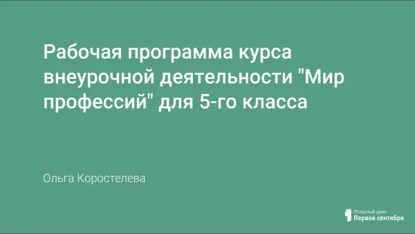 Программа внеурочной деятельности разработана для занятий с обучающимися 5-го класса в соответствии с требованиями ФГОС. Программа внеурочной деятельности «Мир профессий» обеспечивает знакомство с разнообразием профессий на уровне начального общего образования, обеспечивает условия для исследования способностей обучающихся применительно к рассматриваемой профессии, расширяет представления учащихся о социо-культурных особенностях и значении для общества профессий человека.
