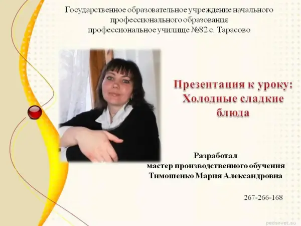 Урок производственного обучения учащихся самостоятельному приготовлению сладких холодных блюд с помощью технологической карты. На уроке учащимся дается возможность закрепить профессиональные умения по применению различных сочетаний приёмов и операций в приготовлении сиропов, компотов, салатов, желе.