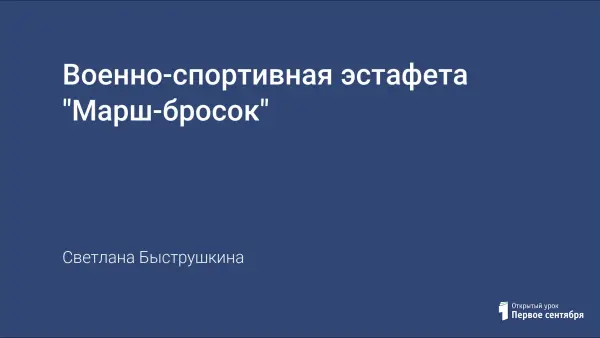 Военно-спортивная эстафета – игра, развивающая гражданско-патриотическую позицию, социально-значимые ценности у подрастающего поколения. Создающийся для проведения эстафеты штаб - орган, разрабатывающий план и критерии оценки. Цель - пройти 11 испытаний и развед-маршрут "Найди знамя". Результат эстафеты - награждение сильнейшей команды и обед участников в "солдатской кухне".
