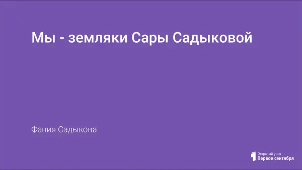 Воспитательное мероприятие, посвященное жизни и творчеству выдающегося татарского композитора Сары Садыковой. Знакомство детей с культурой татарского народа – одна из задач нашего региона. Сара Садыкова – композитор, имя которой можно занести в золотой фонд мирового музыкального искусства. Ее песни, ее музыка посвящены не только татарскому народу, но и людям всей необъятной России, т.к. ее способствует их духовному сближению.