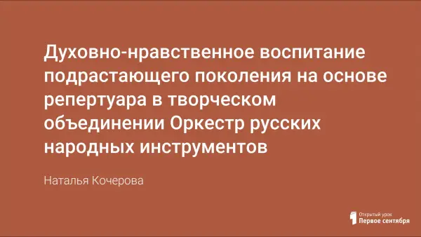 Статья посвящена проблеме духовно-нравственного, воспитания, учащихся через репертуар оркестра русских народных инструментов. С помощью правильно подобранного репертуара решаются художественно-исполнительские задачи. Исполнение русской народной музыки, воспитывает у учащихся любовь к Родине, культуре, чувство гордости за свою страну и патриотизм. Коллективное музыцирование в оркестре русских народных инструментов – не только обучение игре на инструментах, это воспитание личности ребенка, его духовно-нравственных качеств.