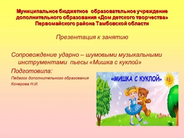 Цель занятия: формирование навыков игры на шумовых музыкальных инструментах при исполнении музыкальных пьес.