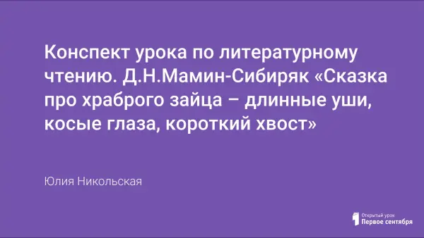 Цель урока: познакомить учащихся с произведением Д.Н. Мамина-Сибиряка «Сказка про храброго зайца – длинные уши, косые глаза, короткий хвост»; продолжить формирование читательской компетенции учащихся; формировать умение высказывать свое отношение к героям, их поступкам, выражать свои эмоции.