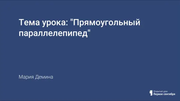 На уроке рассматриваются такие понятия, как "прямоугольный параллелепипед", "объемная фигура", "грани", "ребра", "противоположные ребра", "противоположные грани", "смежные грани", "длина", "ширина и высота прямоугольного параллелепипеда" или его измерения. Вводится понятие "куб". На уроке проводится практическая работа по созданию модели прямоугольного параллелепипеда.