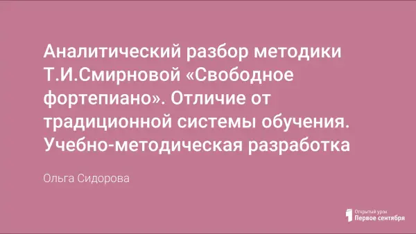 Методика интенсивного обучения на фортепиано Татьяны Ивановны Смирновой известна более 20 лет. На сегодняшний день она носит название «Свободное фортепиано» и ставит в приоритете задачу, чтобы все дети, обучающиеся по этой методике, свободно владели инструментом. В основе любой методики интенсивного обучения лежит принцип «погружения», когда обучающемуся даётся сразу большой объём информации, который осваивается им в практической деятельности. В методике «Свободное фортепиано» одновременно даются задания на развитие чувства ритма, слуха, чтение с листа, играть двумя руками, работать над музыкальными образами, подбирать по слуху, транспонировать, импровизировать. Такой комплексный подход повышает эффективность овладения каждым навыком в отдельности. Каждый следующий этап обучения характеризуется более высоким уровнем освоения всех знаний, умений и навыков.