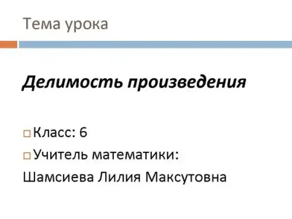 На уроке учащиеся смогут «открыть» и доказать признак делимости произведения на число, используя определение делителя. Фактически шестиклассники впервые сталкиваются с такой непростой задачей, как необходимостью обосновать и даже доказать своё утверждение. При повторении ранее изученного материала, учащимся предлагается определить, какие из предложенных высказываний истинные, а какие ложные.