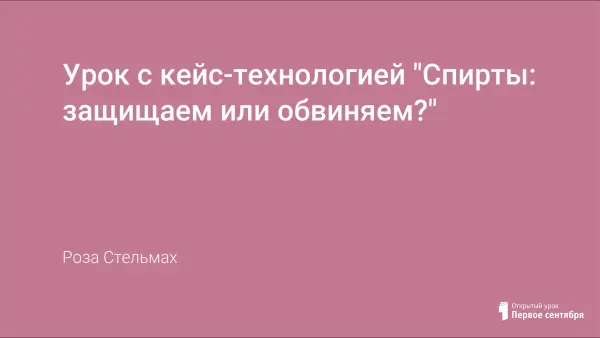 В уроке обобщения темы применяется кейс-технология, повышаюзей мотивации к изучению предмета. Учащиеся в составе группы выявляют ключевые проблемы, касающиеся отношения к спиртам. В кейсе проблема представлена в скрытом виде. Каждый ученик выстраивает маршрут исследования, опираясь на материал кейса. По характеру урок валеологической направленности с элементами пропедевтики. Методы выбраны с целью развития логического мышления, социальных компетенций учащихся и мотивации.