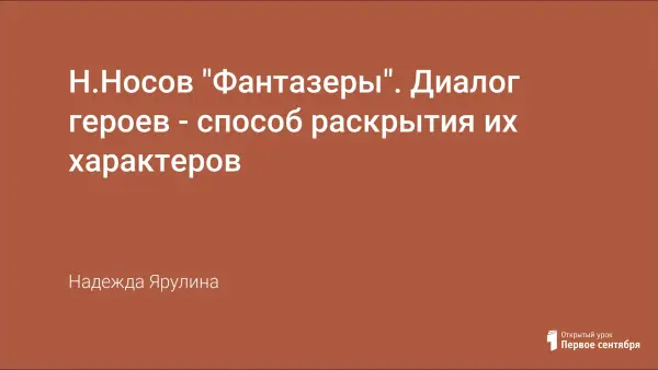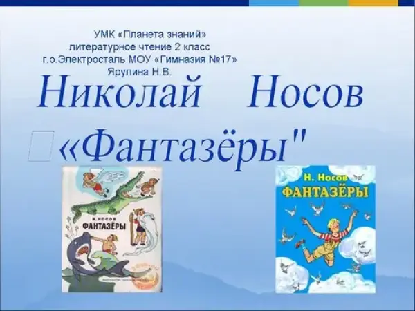 Урок литературного чтения для 2-го класса знакомит учащихся с содержанием рассказа Н.Носова «Фантазёры». Основная цель урока: найти отличия при толковании понятий: неправда и фантазия, врун и фантазёр. На примере диалогов литературных героев постараться раскрыть характеры героев. Урок направлен на обучение выразительному чтению, чуткому отношению к слову, умения высказывать своё отношение к поступкам героев.