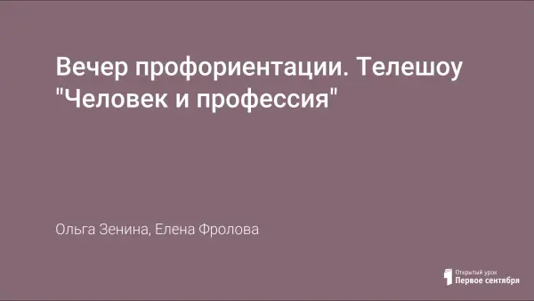 Вечер профориентации – телешоу «Человек и профессия» подготовлен для учащихся 9‒11-х классов. Внеклассное мероприятие развивает коммуникативные компетенции, личностную и познавательную сферу учащегося. Яркие образы, иллюстрации, музыкальное сопровождение, приобретение полезной информации о профессиях мотивирует учащихся к ответственному и осознанному выбору профессии, расширению кругозора.