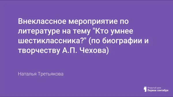 Внеклассное мероприятие в форме игры завершает курс изучения жизни и творчества А.П. Чехова в 5‒6 классах. Учащимся предлагаются вопросы по биографии и творчеству писателя. Многие вопросы содержат дополнительные интересные сведения о биографии и творчестве А.П. Чехова. На мероприятие отводится 40 минут. Интегрированный подход помогает учащимся увидеть образы, созданные автором, музыка олицетворяет душевные переживания героев.
