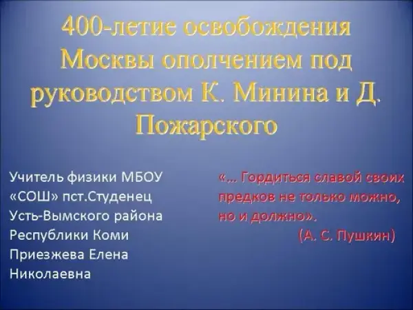 Урок посвящен 400-летию освобождения Москвы, произвел большое эмоциональное воздействие на учащихся. Материалы урока могут использоваться учителями, классными руководителями в учебной и внеклассной работе для воспитания чувства гордости и любви к родине, привития уважения к героическому прошлому своего народа.