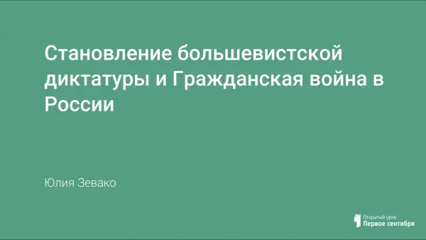 На уроке рассматривается вопрос о неизбежности Гражданской войны после захвата власти большевиками, шаги по установлению большевистской диктатуры как этапа Гражданской войны, основные силы, события, участники, итоги и уроки Гражданской войны. Особое внимание уделено работе с картами, литературно-художественным и аудио-визуальным материалом, интерактивным методам (составление мини-газеты по теме урока), позволяющим сделать урок эмоционально насыщенным и личностно значимым.