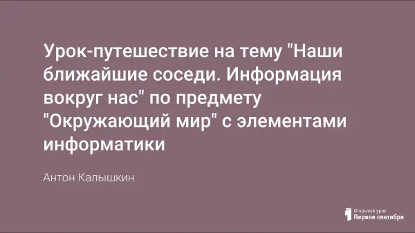 Цель урока: познакомить с государствами - соседями нашей страны. Рассказать о их местоположение на карте, гербе, флаге, столице, достопримечательностях, культуре и быте. Урок даёт возможность детям самостоятельно получать новые знания о некоторых крупных странах мира, развивает у них память, мышление, пополняет словарный запас, воспитывает эстетические чувства, интерес и любознательность, развивает толерантность. На уроке даётся определение понятия «информация».