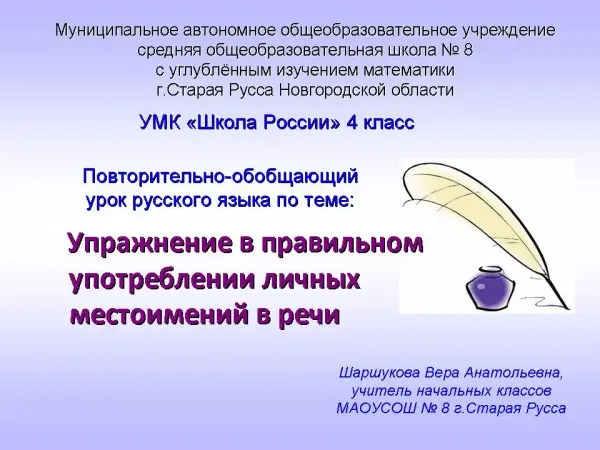 Урок систематизирует знания учащихся о личных местоимениях. В ходе урока учащиеся активно исследуют предлагаемый языковой материал, классифицируют, сравнивают, обобщают, выполняют упражнения и задания.
