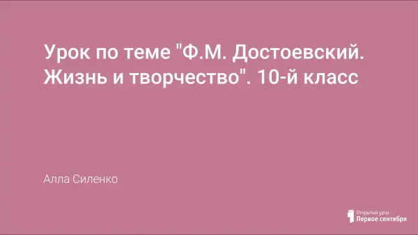 Данный урок в интересной форме знакомит учеников с жизнью и творчеством Ф.М. Достоевского, элементы театрализации погружают учащихся в мир личных переживаний писателя. Уроку предшествует индивидуальная и групповая работа по подготовке сообщений.