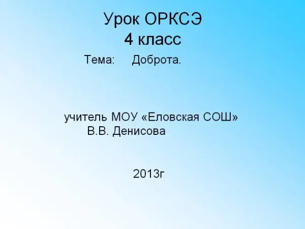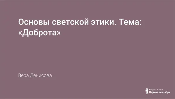 Урок по основам светской этики воспитывает нравственные ценности личности, убеждения в значимости добрых слов, дел и поступков. Цель урока: актуализировать личностный опыт учащихся, усвоить понятия «доброта», расширить и обогатить словарный запас учащихся; развивать умения общаться между собой и с учителем.