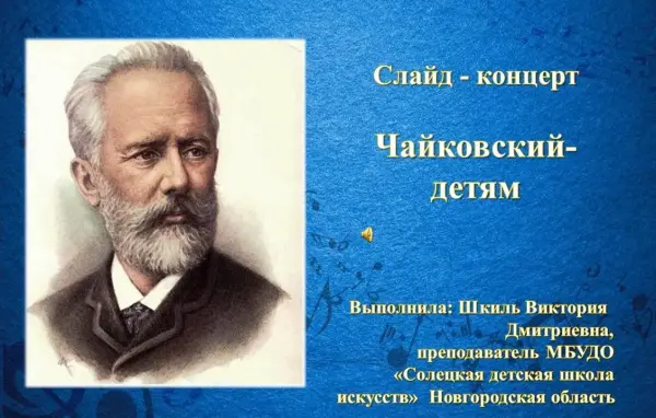 Презентация-концерт: «Чайковский – детям» включает знакомство с биографией композитора и разделом музыкального творчества, которое было создано композитором для детей. Это самый популярный в детской русской фортепианной литературе «Сборник легких пьес для детей» ор. 39, под названием «Детский альбом». Из презентации дети узнают, кому посвящён, как создавался альбом. Исполнят и услышат пьесы из цикла в инструментальном исполнении.Также услышат музыкальные фрагменты из балетов «Лебединое озеро» и «Щелкунчик». Приобщаться к классической музыке, обогатят свои музыкальные впечатления, повысят уровень исполнительского мастерства. Узнают, как увековечена память о великом русском композиторе в России.