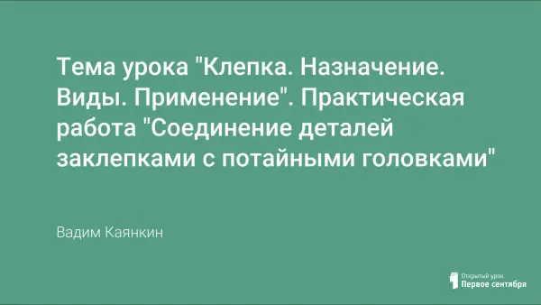 Тема урока "Клепка. Назначение. Виды. Применение". Практическая работа "Соединение деталей заклепками с потайными головками"