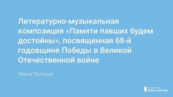Композиция посвящена всем, кто не вернулся с войны, кто еще жив и помнит о тяжелых страницах нашей страны. В содержание литературно-музыкальной композиции вошли стихи и песни, которые в совокупности раскрывают и дополняют основную цель постановки – формирование у школьников позиции защитника и патриота своей родины. Ориентирована на школьников среднего и старшего возраста.