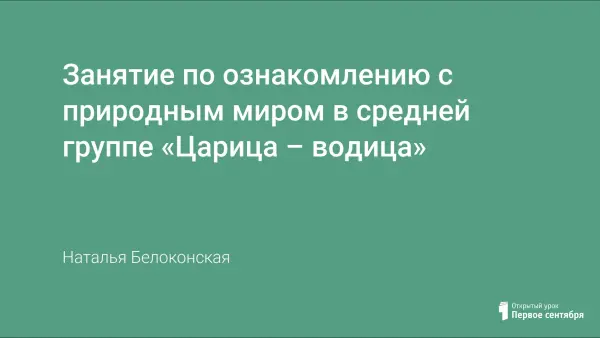Занятие по ознакомлению с природным миром «Царица – водица» предназначено для детей средней группы детского сада. Его цель – систематизировать знания детей о водных ресурсах Земли. На занятии уточняются представления детей о том, что вода очень важна для всех живых существ, без неё не могут жить растения, животные, человек. Дети знакомятся с тем, что вода бывает пресной и солёной. Опытным путём подводятся к выводу, что солёная вода сильнее выталкивает погружённые в неё предметы.