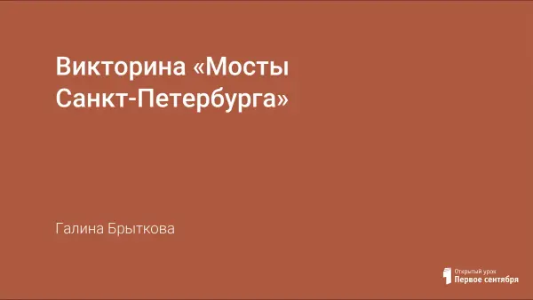 Викторина «Мосты Санкт-Петербурга» посвящена истории Санкт-Петербурга, обобщает знания, расширяет кругозор учащихся, развивает эрудицию, активизирует мышление подростков. Викторина может быть использована как внеклассное мероприятие или дополнительный материал на уроках истории.