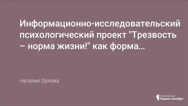 Проект направлен на формирование психологии трезвости среди школьников, утверждение и сохранение морали трезвости. Несмотря на серьезные меры, предпринимаемые органами и учреждениями различной ведомственной подчиненности в области профилактики употребления психоактивных веществ: особенно курение, уровень их распространенности продолжается. Участники проекта – волонтёры отряда «За здоровый образ жизни».