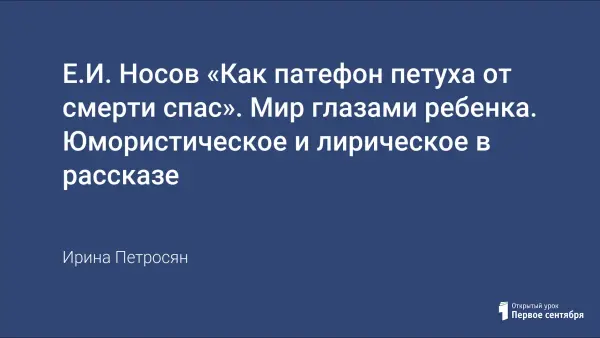Цель урока: знакомство с некоторыми фактами биографии Е.И. Носова, оказавшими влияние на формирование мировоззрения писателя; воспитание интереса к жизни и творчеству Е.И. Носова; выявление художественной идеи рассказа «Как патефон петуха от смерти спас»; формирование навыков выразительного чтения, самостоятельной исследовательской работы с текстом, пересказа, нравственно-эстетических представлений учащихся в ходе выявления лексического значения слова "жалостливый".