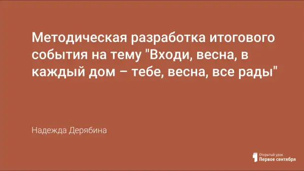 Методическая разработка итогового события на весны, которое проводится с целью познакомить детей с обрядовыми действиями, сопровождающими народные праздники. Задачи: формировать первоначальные представления о жанре русского фольклора – закличка; учить устанавливать простейшие связи между временем года и событиями в жизни русского народа; продолжать формирование диалогической речи и обогащение словаря в процессе знакомства с малыми фольклорными формам.