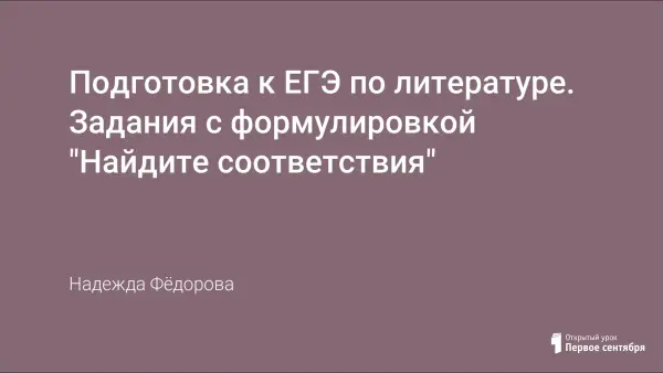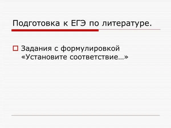 В 2012 году в ЕГЭ по литературе было введено задание, которое не входило в основные пособия по подготовке к ЕГЭ по литературе. Задания с формулировкой «Установите соответствие…» проверяют знания текстов, отмеченных в кодификаторе, основных персонажей произведений, событий, связанных с героями. Презентацию можно использовать на факультативных занятиях при подготовке к ЕГЭ по литературе, провести как итоговое повторение в виде игры-викторины.