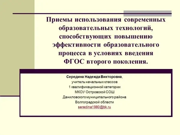 Текст доклада включает в себя демонстрацию и анализ приемов использования на занятиях современных образовательных технологий. Особое внимание уделяется здоровьесберегающей системе В.Ф. Базарного и ИКТ-технологии. Немаловажны результаты работы по новому образовательному стандарту.