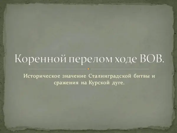 В статье, показан ход военных действий на советско-германском фронте летом 1942-го – осенью 1943 г., героизм и мужество советских воинов, основные события коренного перелома в ходе Великой Отечественной и Второй мировой войны.