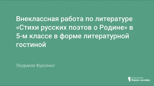 Литературная гостиная в 5-м классе, где ребята будут слушать выразительное чтение учителя, голос автора на диске, читать стихи собственного сочинения, пытаться сделать первые «пробы пера». Данная тема введёт учащихся в своеобразный мир поэзии, покажет глубокое чувство поэтов к родной природе, истории и Родине, поможет воспитывать патриотизм и чувство гордости за свою Родину.