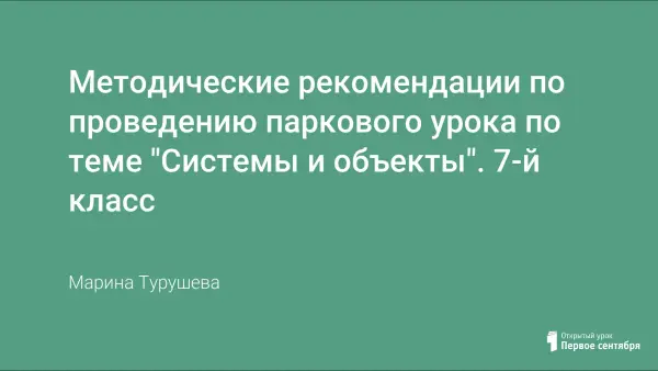 В статье описана методика проведения паркового урока по теме "Системы и объекты" по информатике в 7-м классе в соответствии с требованиями новых стандартов. Педагогическое взаимодействие учителя и учащихся на уроке подробно описано в технологической карте урока. В технологической карте прописано на каждом этапе урока формирование универсальных учебных действий (УУД) - познавательных, коммуникативных, регулятивных.