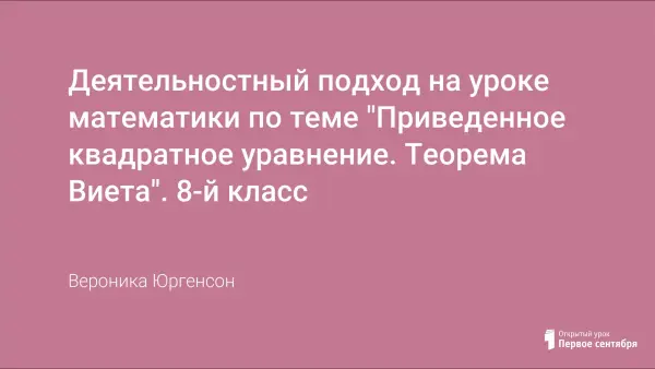 К концу урока в 8-м классе учащиеся должны у предложенных учителем приведенных квадратных уравнений находить сумму и произведение корней их знаки и решать квадратные уравнения с помощью формулы Виета. Урок применяет деятельностный подход, актуализацию знаний, постановку учебной проблемы, открытие новых знаний через решение проблемы, первичное закрепление и рефлексию. Используются организационные формы на уроке: фронтальная работа, в группах, индивидуальная.