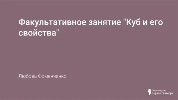 Куб – один из видов правильных многогранников. Зачем кубы в жизни? Что же такое куб? Знаем ли мы, что такое вершина, ребро, грань, поверхность куба? Сколько измерений имеет куб? Как найти площадь поверхности куба? Занятие посвящено кубу и его свойствам. На занятиях учащиеся узнали: какая фигура называется кубом, рассмотрены его свойства; научились вычислить площадь поверхности и объём, изготавливать кубы разной величины и из разных материалов, сравнивать массу кубов одного объема, но разной плотности.