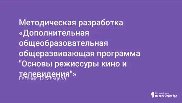 Программа предназначена для подростков, желающих познакомиться с основами профессии режиссёра кино и телевидения и получить навыки создания короткого видеофильма. Данная программа включает в себя: основы теории режиссуры кино, написание сценариев, анализ фотографии (кадра), взаимодействие с актёрами на сценической площадке, перенос полученных навыков работы в съёмочный процесс и знакомство с монтажной программой.