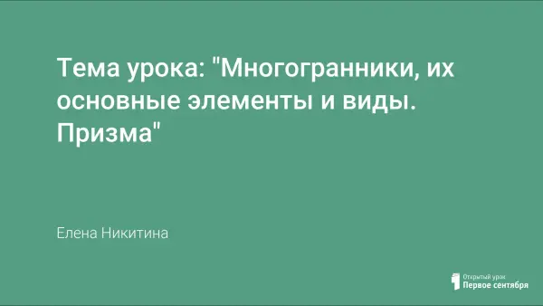 Занятие рассчитано на учащихся школ старших классов и студентов 1-го курса НПО (СПО). Цель урока: познакомить учащихся с понятиями "многогранник" и "призма", основными элементами и видами; закрепить умение находить решения задач с помощью математических формул, воспитывать наблюдательность, стремление к взаимовыручке и умение работать в группе. Пространственное мышление учащихся формируется с помощью наглядных моделей тел и хорошей анимацией презентации.