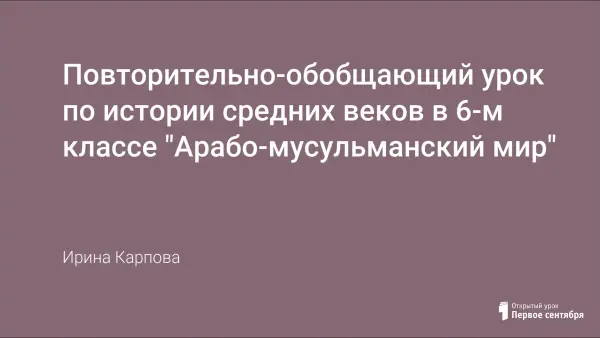 Цель урока: закрепление и обобщение знаний об истории и культуре арабов. Учитель стремится привить уважение и интерес к арабо-мусульманской цивилизации, закрепить умения и навыки работы с дополнительной литературой и картой. Учитель воспитывает чувство сопричастности к истокам современной мировой цивилизации, и желание объяснить современные события на Востоке старинными цивилизационными особенностями.