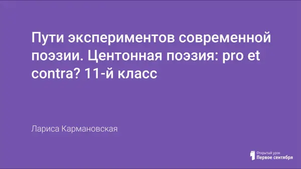 Основная цель урока – расширить представление учащихся о современной поэзии. Новый материал о поэзии постмодернизма конца XX века подаётся с опорой на изученное о поэтах Серебряного века и поэтах 20-х годов (конструктивисты, обэриуты). Даётся представление о ведущих авторах центонной поэзии 2-й половины XX века (А.Ерёменко, Тимур Кибиров).